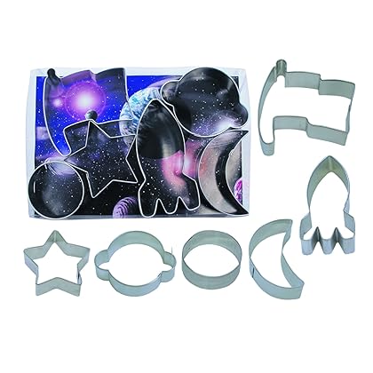 Space Cookie Cutter 6 Piece Set is best for youTinplated steel Space cookie cutter set. Includes Rocket 4', Star 2.75', Crescent 3', Flag 3.25', Planet 3.25' and Biscuit Cutter 2'. Hand wash and dry thoroughly before storing.