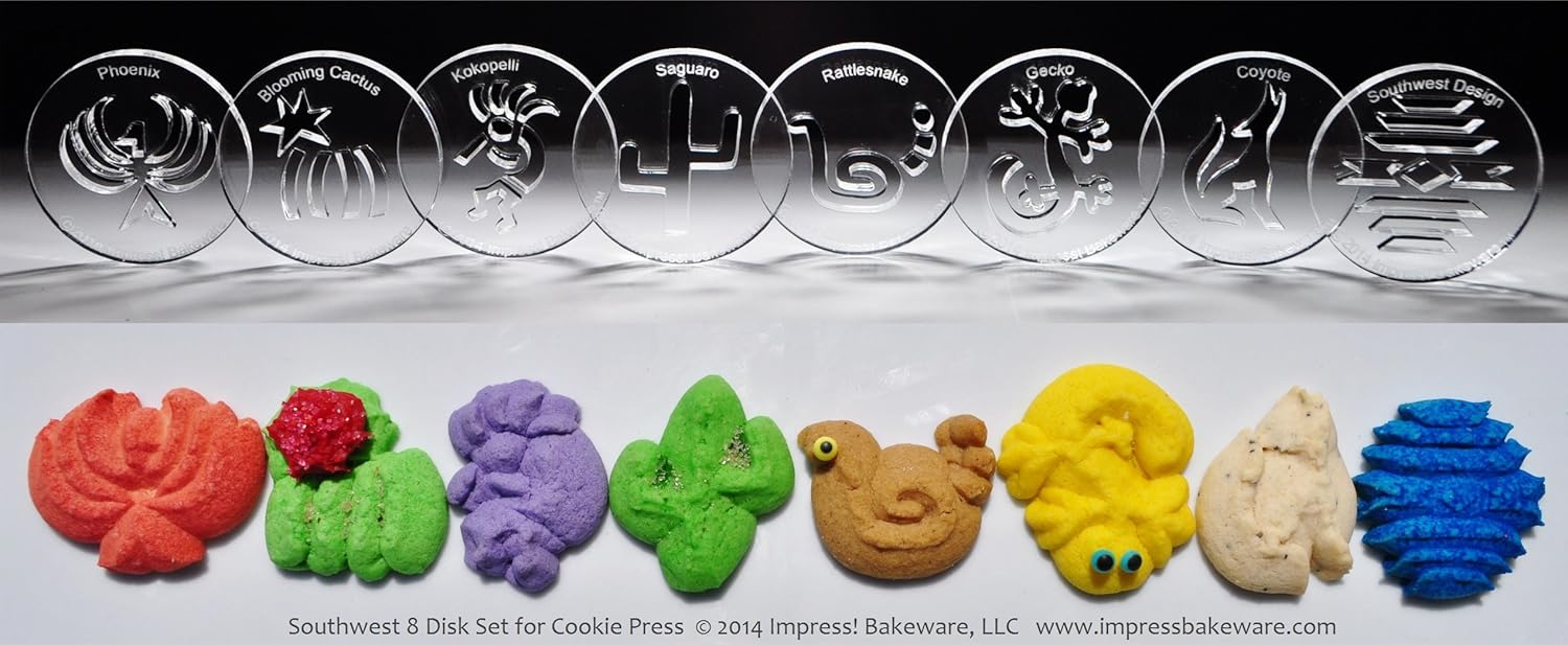 Southwest 8 Disk Set for Cookie Presses (SIZE M disks for presses that came with METAL disks) is best for youNew from Impress! Bakeware™, PressGems™ & PressPals™ Cookie Press Shapes! Buy over 200 new & unique cookie press disks. Your cookie press isn't just for Christmas anymore, now you can get creative with your cookie press all year long! Make dozens of new shapes of cookies *with the press you already own*. Our disks fit most cookie presses (See last images above for Press Sizing Guidelines and FAQ's.). No messy floured surfaces like cutout cookies, and pressing cookies is faster & easier than using cookie cutters. Our disks are made with a special 3/16' thick, highly durable, BPA-free plastic material and create consistent, detailed shaped cookies. All of our disks come with a basic Spritz cookie recipe to get you started, as well as decorating ideas and cookie press troubleshooting tips. Happy baking!