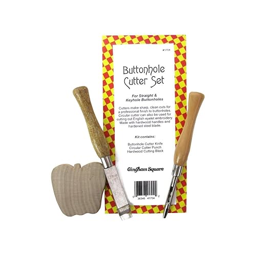 Gingham Square Buttonhole Cutter Set is best for youGingham Square Buttonhole Cutter Set is for straight and keyhole buttonholes. The cutters make sharp, clean cuts for a professional finish. The circular cutter can also be used for cutting out English eyelet embroidery. Made with hardwood handles and hardened steel blades. 3pc- Each kit contains one buttonhole cutter knife, one circular cutter punch, and one hardwood cutting block that is apple shaped.