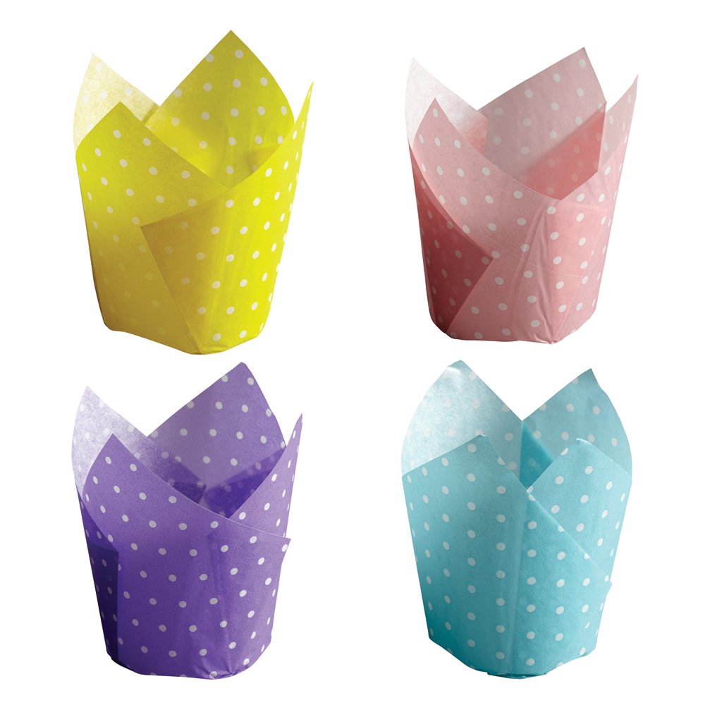 • The Hoffmaster 611124 Dotted Tulip Cup Cupcake Wrapper, 4-Color Assortment, 4-5-Ounce Capacity, 2-1/4" Diameter x 4" Height, Large (4 Packs of 125) is a