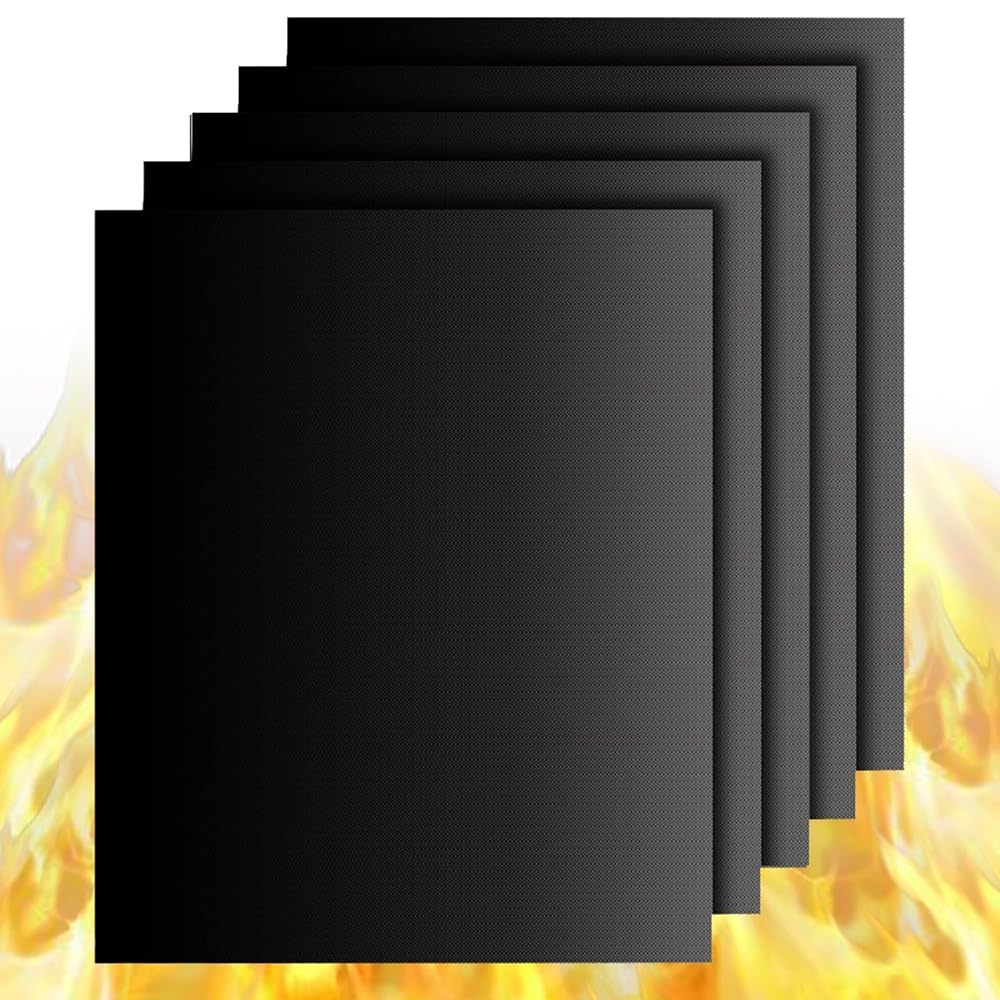 • The Non-Stick BBQ Grill Mat Perfect for Baking on Gas, Charcoal and Electric Grills - Reusable, Durable, Heat Resistant Barbecue Sheets For Grilling Meat, Veggies, Seafood(5 Pack) is a
