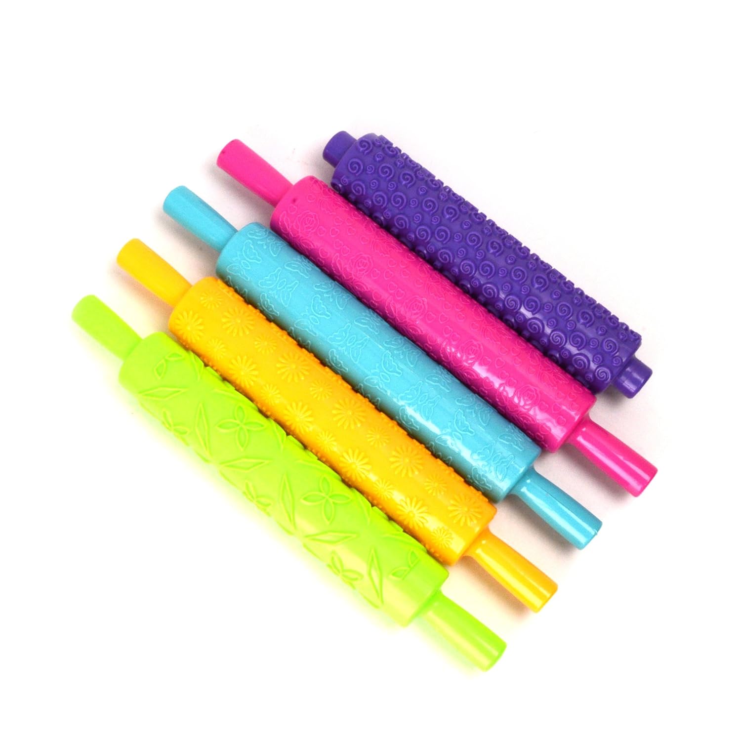 • The Mandydov Set of 5pcs Colorful Plastic Embossed Textured Patterned Fondant Rolling Pins Cake Decorating Tool is a