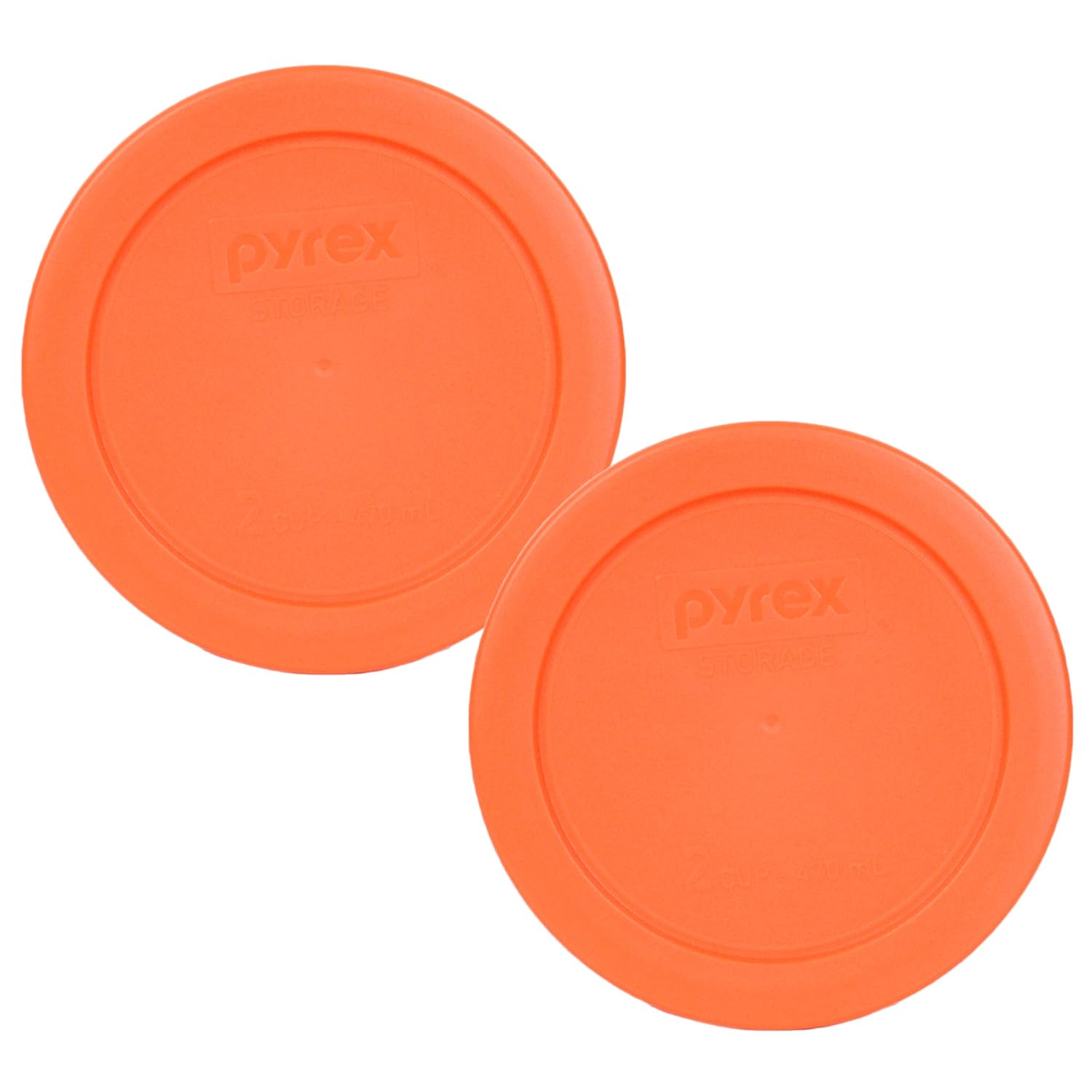 • The Pyrex Orange 2 Cup 4.5" Round Storage Cover #7200-PC for Glass Bowls - 2 Pack is a