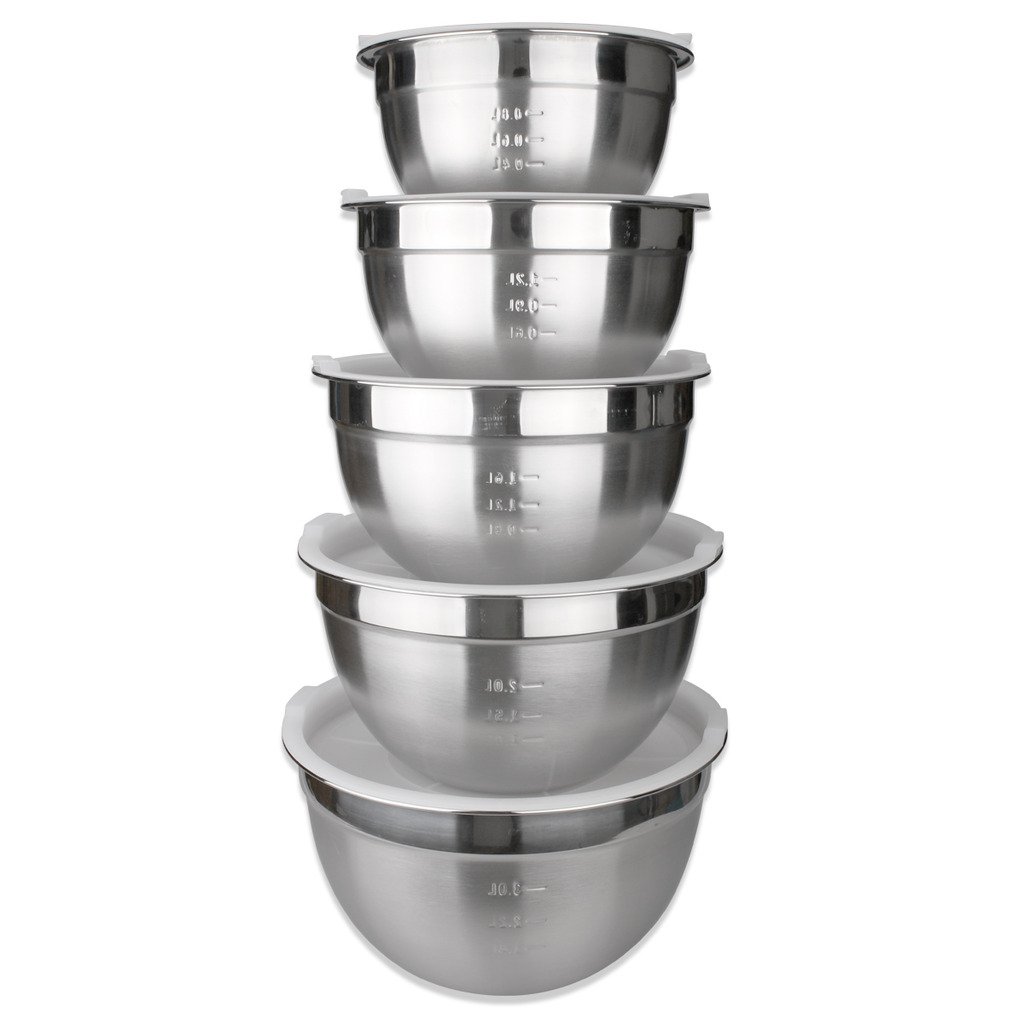 - Made of high quality stainless steel- 3 different sized mixing bowls with lids: 1.13 L , 2.36 L , 4.35 L (liters)(1.2 qt , 2.5 qt , 4.6 qt (quarts)). Great for any job in the kitchen, big or small!- Bowls have a non slip silicone base: No more making a mess when your bowl moves around while you're mixing!- Large bowl has a hole for using an stick / hand blender / electric hand mixer without splash back! Also includes a cap so the hole can be covered for food storage- The bowls are easily stackable to save space and are dishwasher safe (without the lids).- 3 grating attachments: Your set comes with a coarse grater , fine grater , and a slicer grater to use on the large bowl to make your life that much easier!- 4 piece stainless steel measuring cup set: (1/4 cup , 1/3 cup , 1/2 cup , 1 cup)- 4 piece measuring spoon set: (1/4 tsp , 1/2 tsp , 1 tsp, 1 tbsp)- Measuring spoons and cups are held together with an interlocking storage ring.the Stainless Steel Mixing Bowls Set of 5,with Plastic Lids-JUNING set provides Accurate Measurements of ingredients for all your Cooking needs. Made of Heavy-duty stainless steel, this set will not rust and is made for both liquid and dry ingredients. Features a secure insert ring and hang-friendly handles.Are you one for trying new recipes? Whether you're a novice or a real pro in the kitchen, a perfect meal comes down to the hint of ‘this’ or the pop of ‘that’. But how do you get all those flavorful details in the mix? You’ll never go wrong with a set of Kitchen Mission stainless steel measuring spoons handy. Never underestimate the importance of proper measurements in your next recipe.Set of 6, 4 Mixing Bowls, a measuring cup and spoon set. High Quality Durable mirror finish 8/8 stainless steel construction. The sleek design allows the bowls to nest inside each other for easy storage. The bowls are light weight and easy to use, flat base, and curved lip.Stainless Steel Mixing Bowls Set of 5,with Plastic Lids-JUNING is best for youStainless Steel Mixing Bowls Set of 5,with Plastic Lids; An elegant 5 piece set of stainless steel mixing bowls with plastic lids.The quality of the bowls are amazing.When you done mixing; you can put a lid on it and put in the refrigerator.This is an excellent set of top chef quality mixing bowls and a dishwasher safe!